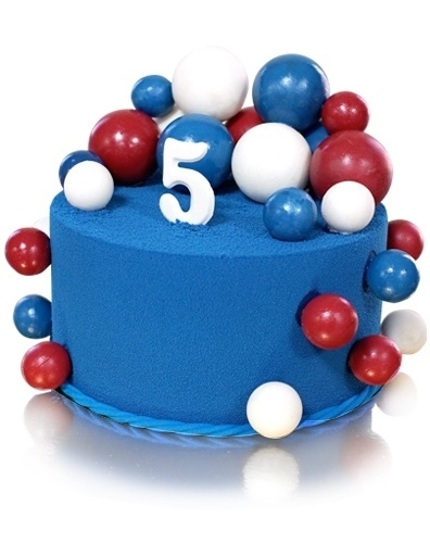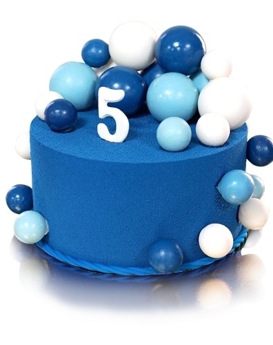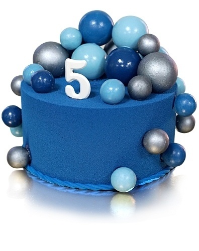 Круглый торт в 1 ярус, покрытый синим шоколадным велюром. Торт украшен веткой шоколадных средних и маленьких шаров разного цвета.