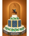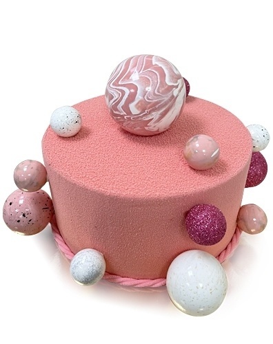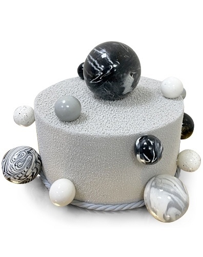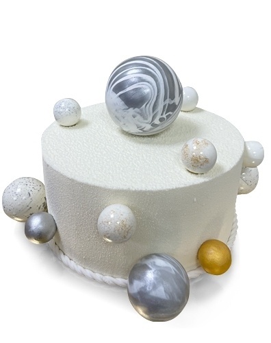 Круглый торт в 1 ярус, покрытый шоколадным велюром. Торт украшен шоколадными планетами разного размера в цветовой гамме покрытия, с разводами и без. По нижней части торт украшен канатиком из сладкой массы в цвет торта, а так же шоколадным логотипом. Дополнительно можно добавить шоколадную цифру на торт, а так же надпись шоколадными буквами перед тортом.