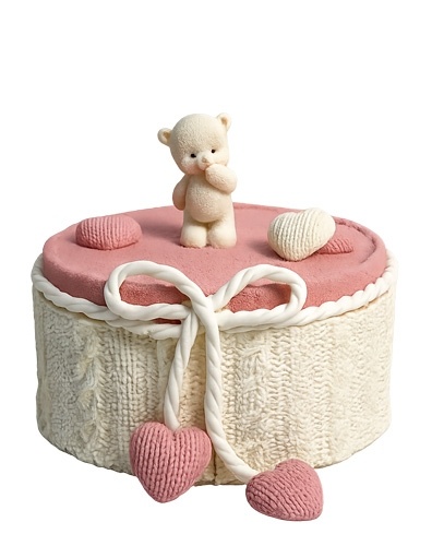 Торт круглый в 1 ярус, покрытый нежно-розовым шоколадным велюром. На поверхности торта расположен маленький белый шоколадный мишка и вязанные сердца. Боковую поверхность торта украшает вязанный декор молочного цвета. Дополняет композицию бантик из канатика с розовыми сердцами.