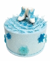 круглый в 1 ярус, покрыт белым шоколадным велюром. На поверхности