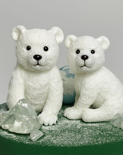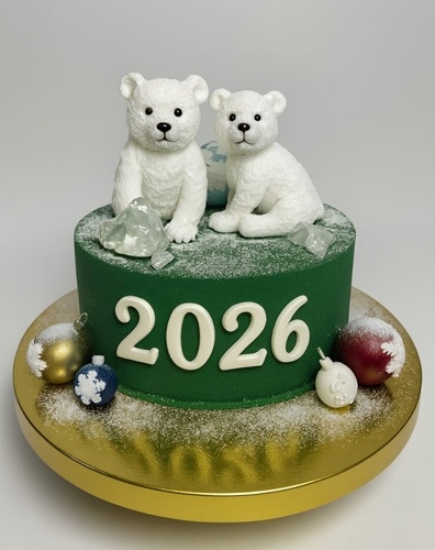 Торт круглой формы в 1 ярус покрытый шоколадным бархатным велюром зеленого цвета. Поверхность торта украшена фигурой белых медвежат, выполненных из сладкой массы на основе какао масла. Дополняют декор карамельные льдинки и сахарная пудра. На боковой поверхности торта расположены шоколадные цифры 2026 белого цвета. По низу торт украшен шоколадными шарами.