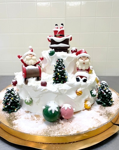 Торт 2 яруса, круглой формы, покрытый сливочным узором в стиле «сугроба». Главное украшение торта - фигурки забавных дедушек морозов в интересных позах. Дополняют композицию шоколадные декорации в виде елочек с шариками, а так же елочных игрушек разного размера и цвета. Торт и поверхность около торта присыпана сахарной пудрой.