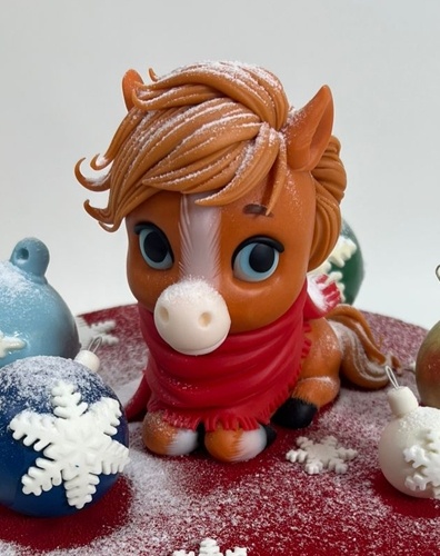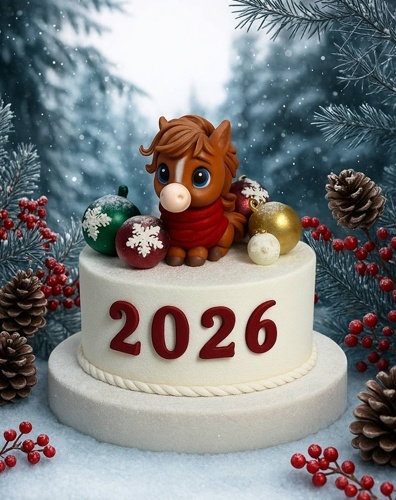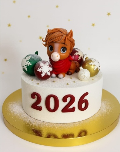 Круглый торт в 1 ярус покрытый шоколадным бархатным велюром белого цвета. Поверхность торта украшена фигурой лошадки в шарфике , выполненной из сладкой массы на основе какао масла и шоколадными новогодними шариками синего и золотого цвета с белыми снежинками. На боковой поверхности торта расположены шоколадные цифры 2026 красного цвета. Дополняет декор сахарная пудра. Диаметр торта 24 см , высота торта 10 см без учёта декора.