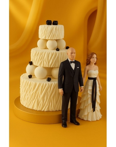 украшением являются фигурки жениха и невесты, стоящие перед тортом,