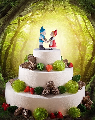 Торт в 3 яруса, покрытый шоколадным велюром цвета слоновой кости. Верхний ярус торта украшают фигурки гномов держащихся за руки, выполненные из сладкой массы на основе какао-масла. Нижний ярус торта украшен шоколадными шишками, карамельными зелеными шарами и клубничками, выполненными из сладкой массы на основе какао-масла.