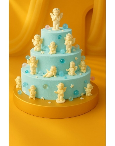 Необычный свадебный торт на заказ в 3 яруса, покрытый светло-голубым шоколадным велюром. Торт украшен шоколадными купидонами разного размера, выполненными из бельгийского шоколада. Дополняют композицию разноцветные карамельные шарики и маленькие шоколадные бабочки.