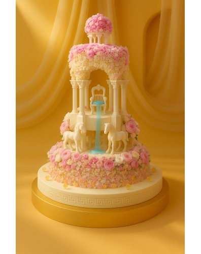 - подставка между 3 –м и 4 –м ярусами, выполненная в виде беседки, внутри которой стоит шоколадный фонтан с «льющейся» карамельной водой. Между колоннами сидят большие шоколадные львы.