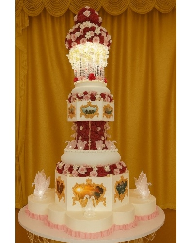 -нижний ярус в форме цветка, на каждом лепестке которого стоит карамельный лебедь с подсветкой,