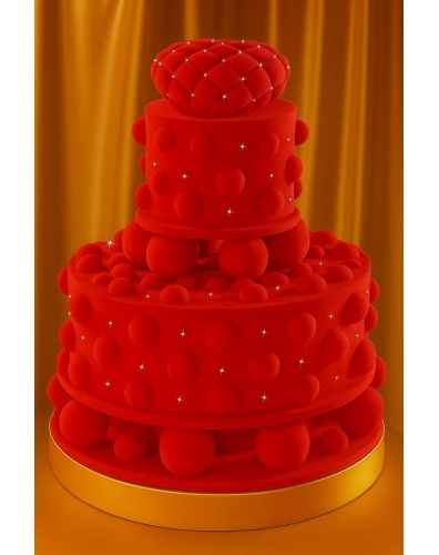 Роскошный и яркий свадебный торт красного цвета. Ярусы торта лежат на подставках из шоколадных шаров. Наверху алое сердце.