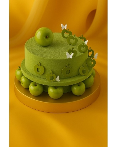 Зеленый свадебный торт с яблоками тоже зеленого цвета из шоколада.