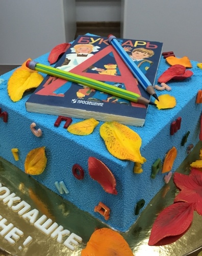 Торт на заказ в 1 ярус, покрытый шоколадным велюром зеленого цвета. Главным украшением торта является шоколадный букварь и два карандаша, выполненные из сладкой массы на основе какао-масла. Композиция дополнена разноцветными листиками, выполненными из сладкой массы на основе какао-масла, и шоколадными буквами.