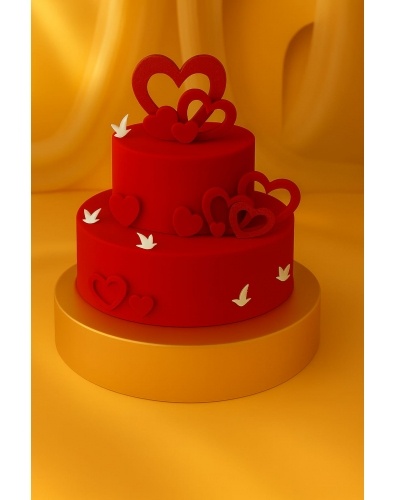Круглый торт в 2 яруса, покрытый красным бархным велюром. Торт украшают необычные сердечки из шоколада разного размера в красном цвете с блестками и без, которые располагаются в хаотичном порядке на ярусах. Дополняют торт, точечно, несколько сахарных бабочек в белом цвете.