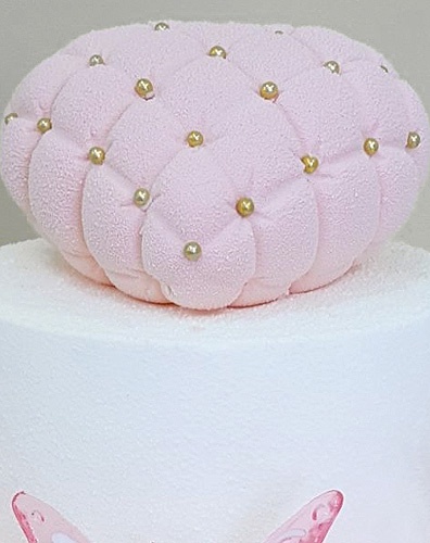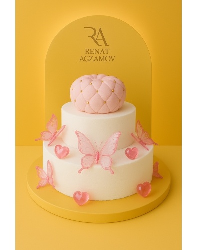 Торт  на заказ в 2 яруса, покрытый шоколадным велюром цвета слоновой кости. Верхний ярус украшен объемным шоколадным сердцем. Нижний ярус торта украшен карамельными бабочками и сердечками нежно-розового цвета.