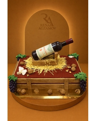 Необычный торт на заказ в 1 ярус, главным украшением которого является бутылка вина Chаteau Petrus, выполненная из карамели, стоящая на подставке в центре торта. Боковая сторона торта украшена декором "под дерево", по углам свисают виноградные гроздья, выполненные из сладкой массы на основе какао-масла. Дополняют композицию шоколадные грецкие орехи.