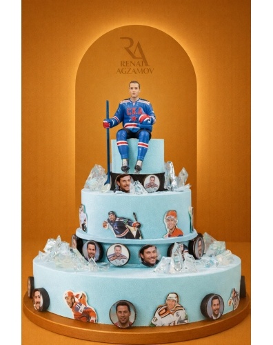 Торт на заказ для любителей хоккея, весом от 6 кг. Хоккейный торт покрыт голубым шоколадным велюром. Главным украшения является фигурка известного хоккеиста, выполненная из сладкой массы на основе какао-масла по фото. Боковая сторона торта для фаната хоккея украшена фотографиями, распечатанными на пищевом принтере по шоколаду. Между ярусами используется подставка из шоколадных шайб. Завершают композицию льдинки из карамели.