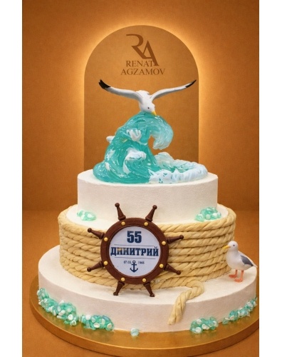 Верхний ярус торта украшает карамельная волна с подсветкой, на которой сидит чайка, выполненная из сладкой массы на основе какао-масла.