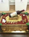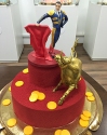 Торт на заказ в 2 яруса, покрытый шоколадным бархатным велюром красного цвета. Главным украшением торта является Китайский Дракон, выполненный из сладкой массы на основе какао-масла. Нижний ярус украшают карамельные черные шарики. Между ярусами использованы подставки из шоколадных шаров.