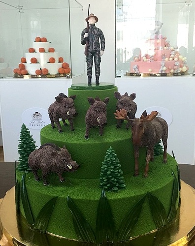 Яркий торт на заказ для мужчин в 3 яруса, покрытый шоколадным велюром зеленого цвета. Верхний ярус торта украшает фигурка охотника, выполненная из сладкой массы на основе какао-масла по фото. Средний и нижний ярус украшают фигурки кабанов и лося, выполненных из сладкой массы на основе какао-масла. Дополняют композицию украшающие нижний ярус елочки. Боковую сторону нижнего яруса украшают шоколадные листья, выполненные из бельгийского шоколада.