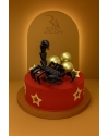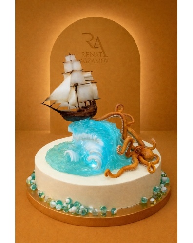 Необыкновенный торт на заказ для мужчины с парусником, в 1 ярус, овальной формы, покрытый шоколадным велюром цвета слоновой кости. В центре торта волна из карамели с подсветкой внутри, на которой возвышается парусный корабль, сделанный из сладкой массы на основе какао-масла. Дополняет композицию огромный осьминог, который хочет утащить корабль в морскую бездну, выполненный из сладкой массы на основе какао-масла. В декорировании торта также использованы карамельные шарики.