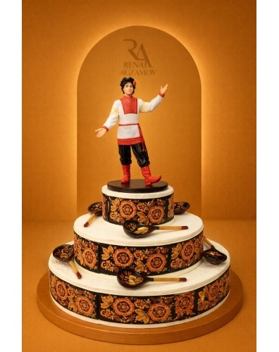 Оригинальный торт на заказ в 3 яруса, выполненный в русском народном стиле, покрытый белым шоколадным велюром. Главным украшением торта в русском стиле является фигурка мужчины в русском народном костюме на верхнем ярусе, выполненная из сладкой массы на основе какао-масла. Дополняют композицию шоколадные ложки, выполненные из бельгийского шоколада. Боковая сторона торта декорирована шоколадной Хохломой.