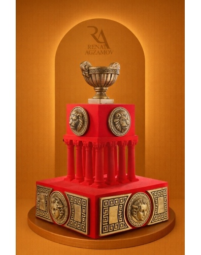 Торт на юбилей мужчины выполнен на заказ с художественной лепкой. Кубок на торте из шоколада, стоит на постаменте, поддерживаемом колоннами. По низу торта шоколадный декор в стиле Версаче.