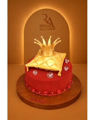 Торт в 1 ярус, покрытый шоколадным велюром красного цвета. Главным украшением торта является золотая стёганная подушка с кисточками , на которой располагается золотая корона , выполненная из сладкой массы на основе какао-масла. Боковую сторону торта украшают карамельные красные полушарики, чередующиеся с сахарными золотыми бусинками. Дополнена композиция карамельными кристаллами.