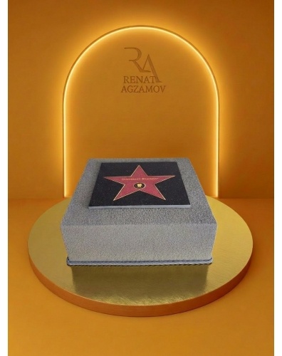 Торт квадратной формы в 1 ярус, покрытый бархатным шоколадным велюром серого цвета. Главным акцентом на торте является шоколадная плита со сладкой фотопечатью, представляющую собой звезду с "Аллеи славы". На звезде надпись имени и фамилии. Дополняет звезду значок с камерой золотого цвета.