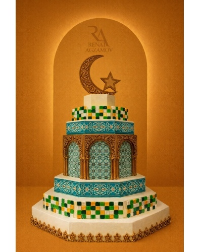 Главным украшением торта является мусульманский полумесяц со звездой высотой 40 см, выполненный из сладкой массы на основе какао-масла.