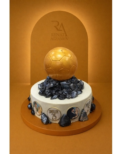 Торт в 1 ярус покрытый шоколадным велюром цвета слоновой кости. Главным украшением торта является футбольная награда "Золотой мяч" - мяч выполнен из бельгийского шоколада, покрытый пищевым золотом, подставка выполнена из карамели. Боковую сторону торта украшают фото, распечатанные на пищевом принтере по шоколаду. Дополняют композицию карамельные глыбы в тон подставки.