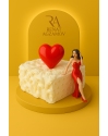 Круглый торт, покрытый белым велюром. Торт украшает фигурка девушки на троне, изготовленная вручную из сладкой массы на основе какао-масла по фотографии. Торт так же украшен красивыми рамками и карамельными шариками.