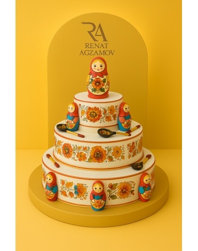 Главным украшением являются шоколадные ложки и матрешки, выполненные из бельгийского шоколада. Матрешки выполняют роль подставки. Боковая сторона торта декорирована шоколадной хохломой.