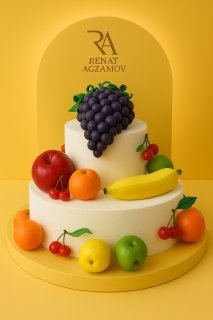 Нижний ярус торта украшают шоколадные яблоки и мандарины, вишня и