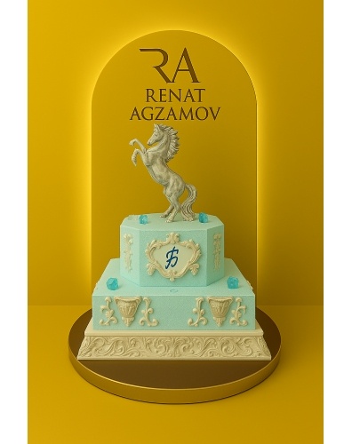 Торт на заказ в 2 яруса, покрытый бледно-голубым шоколадным велюром. Верхний ярус торта украшает шоколадная лошадь из белого бельгийского шоколада, оттонированная пищевым серебром. Боковую сторону верхнего яруса, украшают инициалы в шоколадных резных рамках из белого шоколада, распечатанные на пищевом принтере по шоколаду.