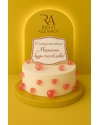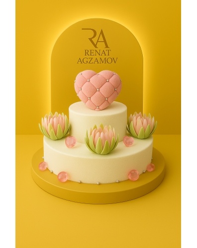 Нежный торт в 2 яруса, покрытый шоколадным велюром цвета слоновой кости. Главным украшением торта является объемное сердце нежного розового цвета - выполненное в технике капитоне из бельгийского шоколада. Дополняют композицию шоколадные хризантемы, нежно-розового цвета , украшающие нижний ярус и карамельные сердечки, украшающие боковую сторону торта.