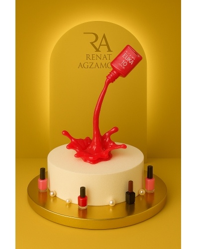 Торт на заказ в 1 ярус, покрытый шоколадным велюром цвета слоновой кости. Главным украшением торта является композиция в виде перевернутой бутылочки лака для ногтей из которой выливается лак. Бутылочка кажется застывшей в воздухе. Боковую сторону торта украшают шоколадные помады, маленькие карамельные лаки и карамельные кристаллы.