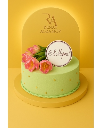 Торт в 1 ярус, покрытый шоколадным велюром нежно-салатового цвета. Главным украшением торта является букет цветов с сладкими тюльпанами, а так же красивая табличка с поздравлением. Боковая сторона торта украшена сахарными золотыми бусинками.