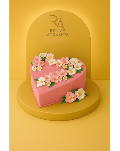 Оригинальный торт в форме сердца, покрытый ярко-розовым шоколадным велюром. По нижней части торт украшен канатиком из сладкой массы в цвет торта, а так же шоколадным логотипом. Сверху торт украшает композиция из шоколадных цветов в бежевой и розовой цветовой гамме с зелеными листиками. Дополнительно можно добавить шоколадную цифру на торт, а так же надпись шоколадными буквами перед тортом.