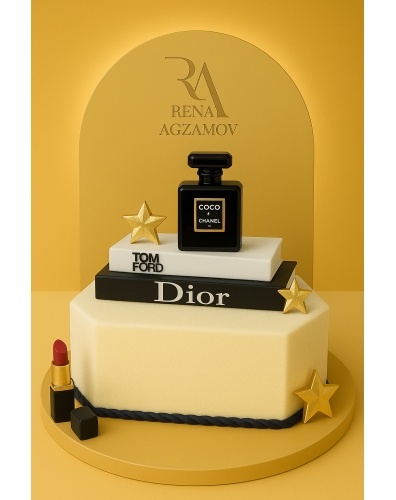 Торт в 1 ярус, квадратной формы со скошенными углами, покрытый белым бархатным велюром. По нижней части торт украшен канатиком из сладкой массы черного цвета. Главным украшение торта является стильная композиция из шоколадных книг и карамельного флакона духов в черно-белой гамме. Дополняют композицию красная шоколадная помада в черно-золотом футляре, а так же шоколадные декорации в виде контурных звезд золотого цвета.