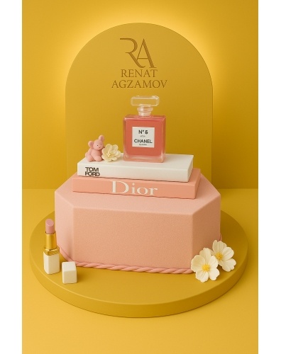 Торт в 1 ярус, квадратной формы со скошенными углами, покрытый нежно-розовым бархатным велюром. Главным украшение торта является стильная композиция из шоколадных книг и карамельного флакона духов в бело-розовой гамме. Дополняют композицию розовая шоколадная помада в бело-золотом футляре, а так же небольшие цветочные композиции, выполненные из шоколада.