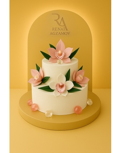 торт в 2 яруса, покрытый бархатный велюром белого цвета. Главным