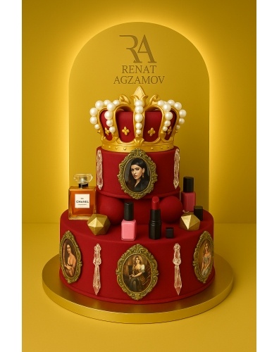 Круглый торт в 2 яруса, покрытый бархатный велюром красного цвета. Главным украшением торта является корона, выполненная из бельгийского шоколада. Дополняют торт карамельные гирлянды прозрачного цвета и резные шоколадные рамки с цветными сладкими фотографиями, располагающиеся по боковой части двух ярусов, а так же духи, лаки, помады и кристаллы выполненные из шоколада и карамели, украшающие поверхность нижнего яруса. Дополнительную высоту и объем торту придает подставка из шаров между ярусами.