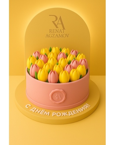Торт в 1 ярус, круглой формы, боковая поверхность которого обрамлена сладкой кондитерской массой нежно-розового цвета в виде подарочной коробки. Верхняя поверхность торта украшена цветами тюльпанами из шоколада, а так же небольшим количеством зеленых листиков.