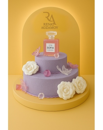 оттенке. Главным украшением торта являются карамельные духи в розовом