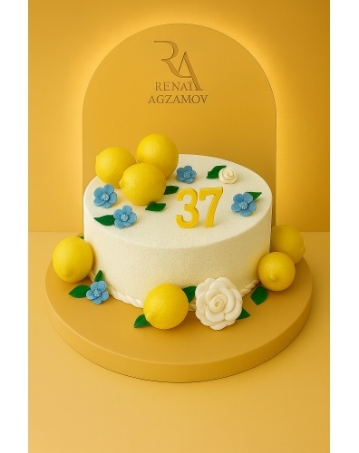 Торт круглой формы в 1 ярус, покрытый шоколадным велюром белого цвета. Главным украшением торта являются ярко-желтые лимоны с зелеными листиками, хаотично украшающие торт и поверхность вокруг торта. Дополняют торт небольшие цветочки в белом и голубом цвете. Все декорации выполнены из шоколада. Дополнительно можно добавить шоколадную цифру на торт, а так же надпись шоколадными буквами перед тортом.