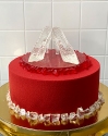 Торт круглый в 1 ярус, покрытый белым бархатным велюром. Главным украшением торта являются карамельными вишенки, выполненные в красном, прозрачном и белом цвете с нежно-зелеными веточками.