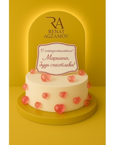 Нежный торт в 1 ярус, покрытый шоколадным велюром цвета слоновой кости. Главным украшением торта, являются розовые карамельные сердца разного размера. В центре торта стоит шоколадная табличка поздравлением.