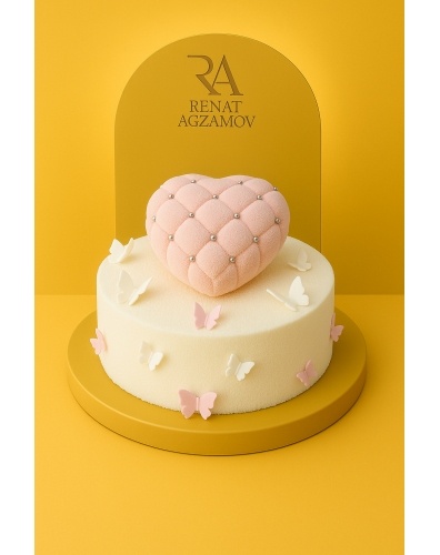 Торт на заказ в 1 ярус, покрытый велюром цвета слоновой кости. Главным украшением торта является объемное шоколадное сердце, украшенное серебряными сахарными бусинками. Композиция дополнена шоколадными бабочками розового и белого цвета.