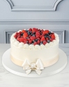 Торт круглой формы в 1 ярус, покрытый белым шоколадным велюром. По нижней части торт украшен лентой из сладкой массы бежевого цвета, а также бантиком с перламутром. Верхняя часть торта украшена узором из воздушного ванильного крема. Главным украшением торта является спелая голубика, расположенная по всей верхней поверхности торта. Дополнительно можно добавить шоколадную цифру на торт, а также надпись шоколадными буквами перед тортом.