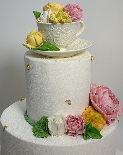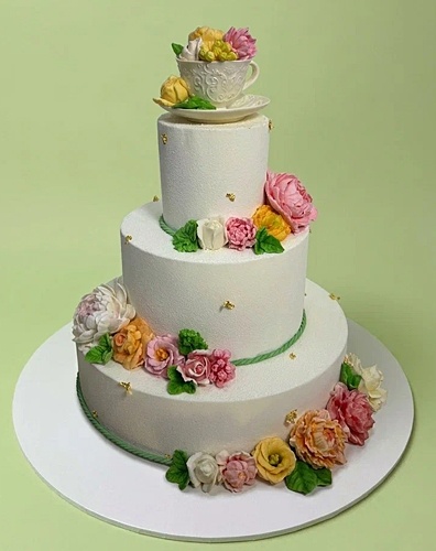 Торт в 3 яруса круглой формы покрыт бархатным шоколадным велюром в белом цвете. По всем ярусам торта расположены цветочные композиции из зефирных цветов. Дополнительным акцентом является сусальное золото, расположенное по всей поверхности торта. Верхний ярус украшает чашка с блюдцем в которой расположен пион.
