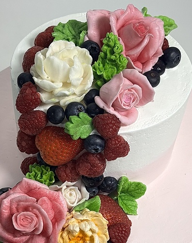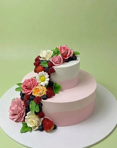 Торт в 2 яруса круглой формы покрыт сливками в градиенте от розового к белому. По боковой поверхности от верхнего яруса к нижнему спускается ветка из свежих ягод и зефирных цветов